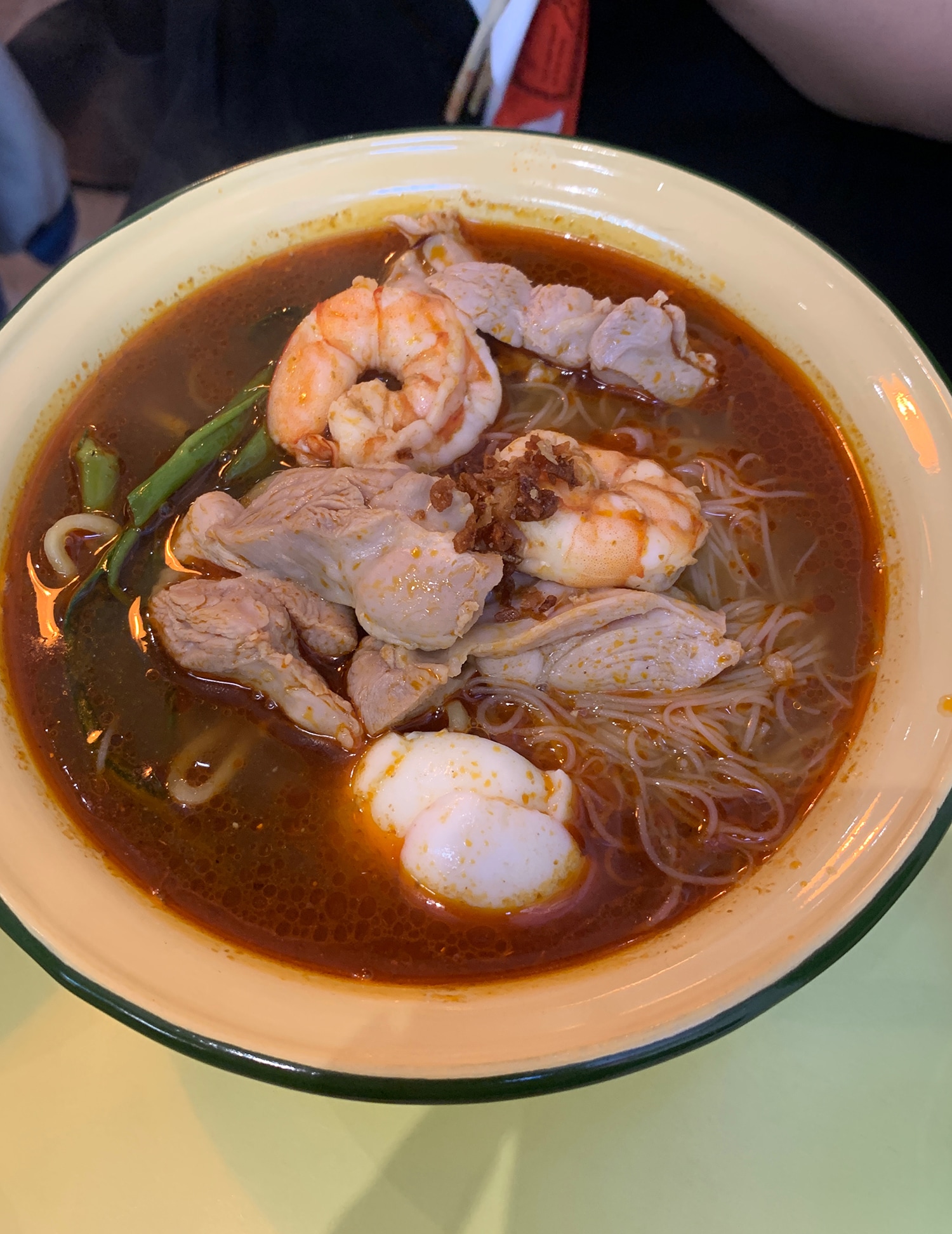 When I went to Penang last September and was told to eat Hokkien Mee I assumed people meant the Hokkien Mee that I have in Kuching - a dry, stir fried, deeply smoky, rounded egg noodle dish. I realised it was ‘prawn mee’ and became slightly obsessed at googling the places I needed to eat it at. The kopitiam near my hotel, I was never early enough for; the vendor shaking his head and packing up “too late, too late!”. It wasn’t until the last day with Liz, that I got there in time. But the best bowl was unexpected: an early evening bar crawl (No Bar Here, Suckling Pig, Chez Chez) and a desperate look around to find something to eat before continuing - up ahead was an intersection with stalls. One stall was selling Hokkien Mee and when we got in line, we could see the dwindling supply. We took the last few bowls, shuffled and squeezed on to a round stainless steel table, ordered cans of beer and inhaled the deep, vivid red bowl of noodles. Sweat dripping down my chest, cold beer sips between mouthfuls. A mix of thin egg noodles and vermicelli, with half an egg, kangkong (water spinach), crispy onions and littered with prawns. It was umami heaven, with the rich prawn head broth, and red chillies for kick and colour. We were all full of laughter, loud, joyful, telling stories with vigour that I have no recollection of.